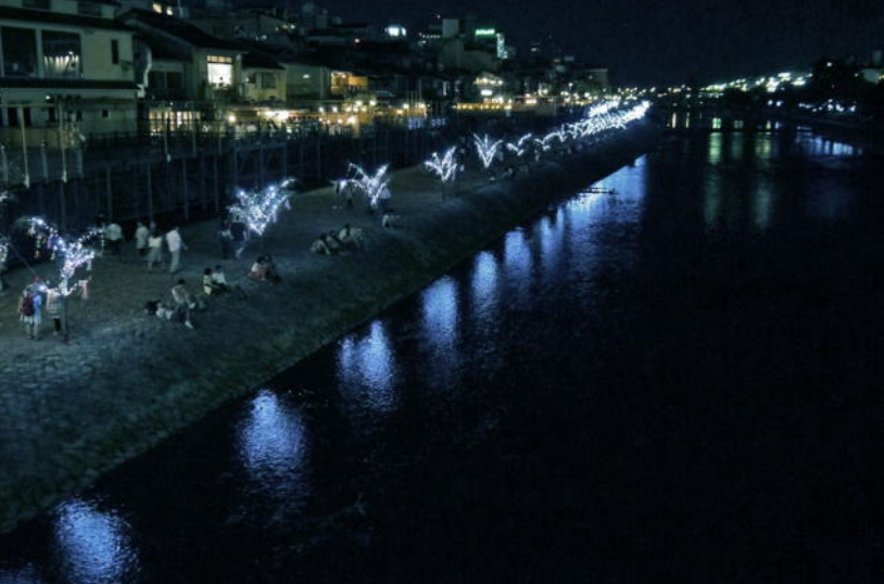 鴨川横の「みそそぎ川」に納涼床が並ぶ