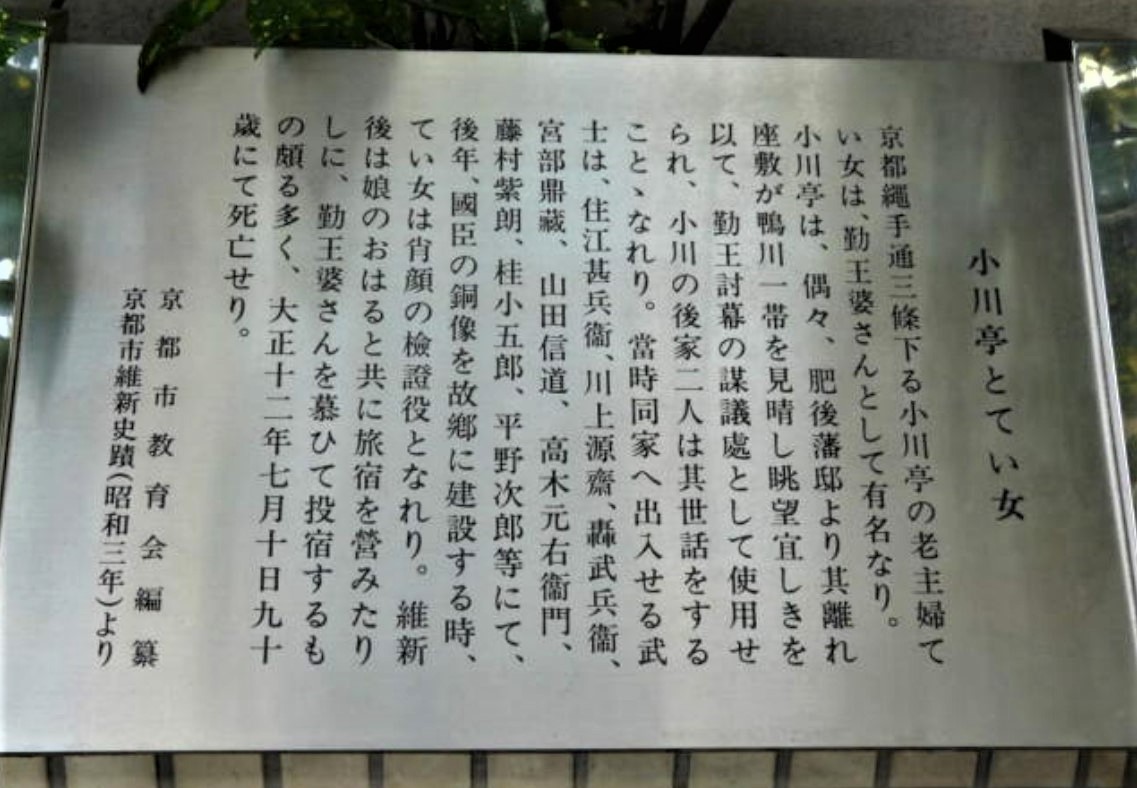 三条大橋東詰にあり、肥後藩、長州藩がよく利用した宿屋であった。女将の「てい女」は勤皇ばあさんとして親しまれていた。