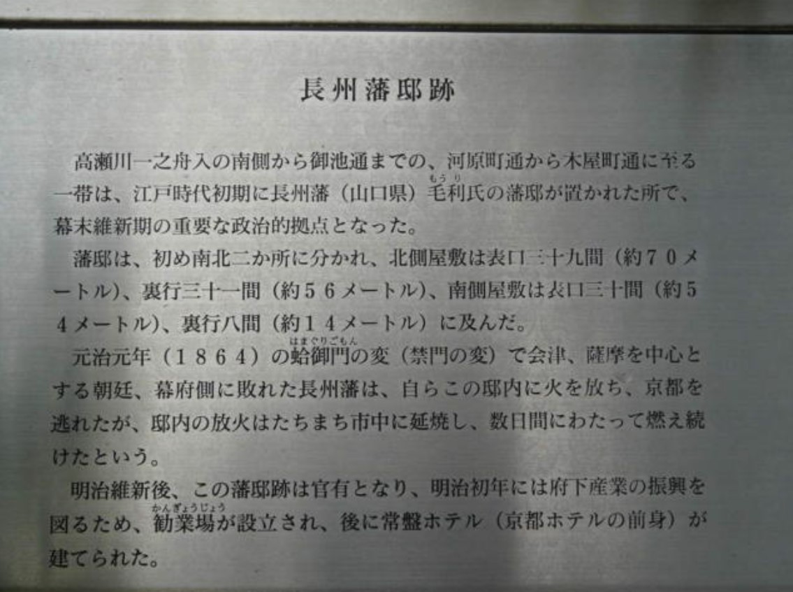 現在の河原町御池通りの京都ホテルオークラの地にあった。桂小五郎(木戸孝允)の像がある。 このすぐ裏に幾松とのロマンスで有名な料亭「幾松」がある
