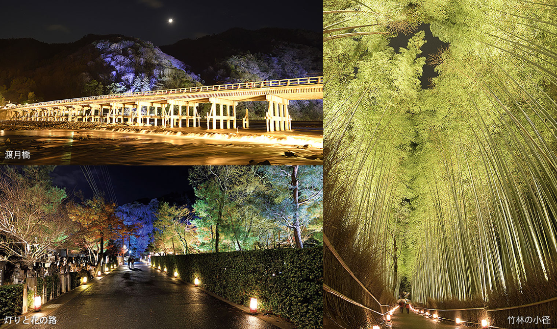 嵐山花灯路 嵐山花灯路201912月13日(金)~22日(日)点灯時間17時~20時30分嵐山・嵯峨野エリアの広い範囲で、ライトアップ風景が楽しめます。竹林の小径は人出多く大渋滞となります。山手で夜間のため、防寒対策が必要。交通アクセスは阪急・嵐電・JRと大変便利です。 公式サイトへリンク