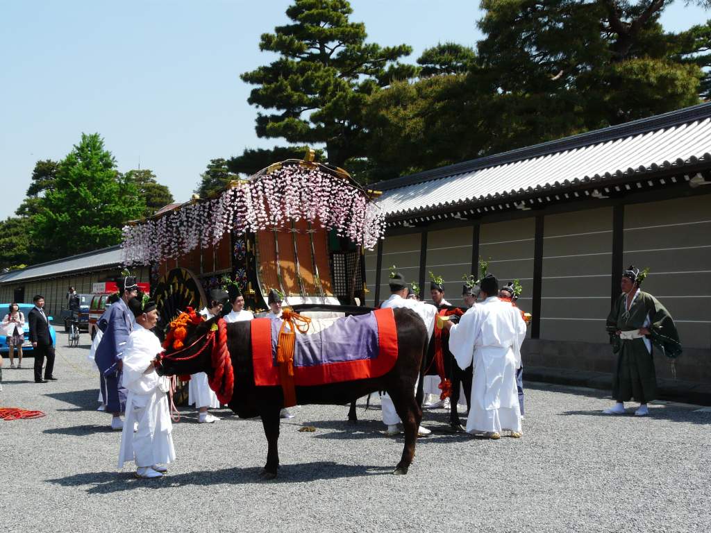 平安貴族の優雅な古典行列。検非違使(けびいし)、御所車、舞人(まいびと)、内蔵使(くらつかい)、斎王大、牛車(ぎっしゃ)、など約1Km・500名の大行列。御所建礼門前を出発、堺町御門から下鴨神社・上賀茂神社までの約5時間の行程。行列全員の頭には賀茂葵(双葉葵)が挿されている。
